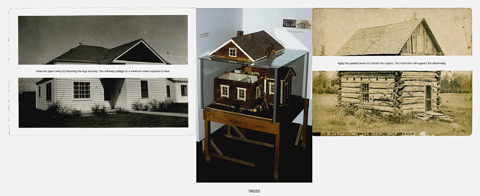 MODEL HOUSE TRUSS questions the relationship between support and vulnerability within domestic structures and draws from Johnson’s intervention (1996) in the ‘Model House’ section of the Pielisen Museum in Lieksa, Finland. The diptych intervention becomes the central image of the triptych.