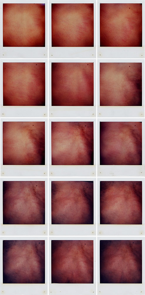VIHTA In Finland the sauna has historically been the place in which women have performed the life-cycle rituals from birthing to washing the dead. Drawing from this history, Johnson and Mortimer chose Sauna No. 60 to site VIHTA. This intervention explored the sauna as a site of transformation and the body’s transition in this context. A performance took place – a photograph taken every 5 minutes – giving evidence to the initiatory experience of experiencing extreme heat and using birch to stimulate the skin. The individual SX-70s were sutured onto the existing metal grill separating the viewer from the sauna space. As one approached, sound was triggered - the transition from pain to pleasure being heard. |